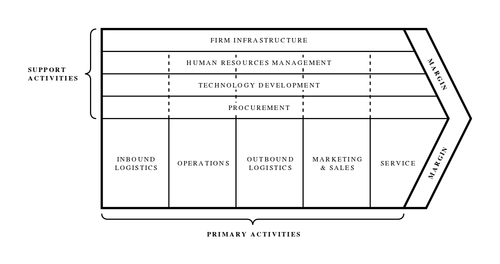 There are two distinct sections; Support Activities, Primary Activities that are in play in any business that generate value helping generate revenue, and hence margin.