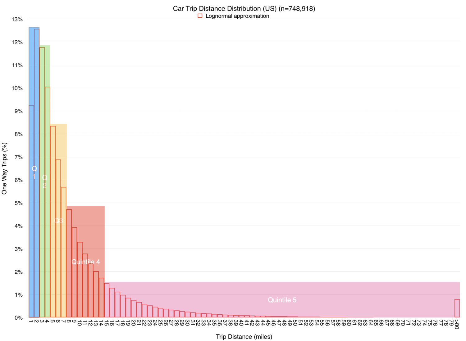 The first to third quintile is made up of rides of between 1 and 7 Kilometres, easily in the range of the types of vehicles served by the Micromobility industry. If the majority of movement is made between 1 to 7 Kilometres and it is currently done with cars with on average less than 2 passengers per ride, we quickly see that traditional cars and certainly fuel powered ones, are an extremely inefficient way to move people around.