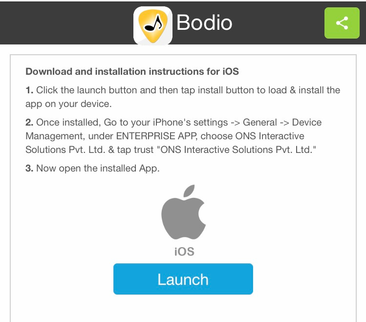 Bodio has developed the app using the AppyPie App Maker platform, which is a sensible move in that it reduces development costs and reduces time-to-market for a working prototype or version 1.0 of the mobile app. Sadly, for Bodio and certainly of no fault of theirs, AppyPie has gone for the side-loading option, in violation of the terms of the contract with Apple. Give that there is enormous pressure on Apple to crack down on this shadow distribution, I doubt it’ll be long before the app no longer works, as I understand Apple are systematically looking through apps to identify violators and have their certificate revoked.
