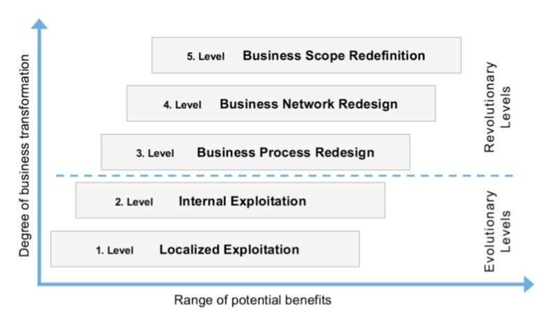 To recap, the five levels are named as: Localized Exploitation, Internal Exploitation, Business Process Redesign, Business Network Redesign and Business Scope Redefinition.