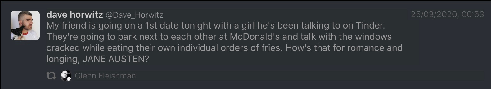 I enjoyed the tweet, the idea that a younger generation is taking it in their stride, compensating and coming up with simple, but effective ideas to continue. Dating is so essential for the world, and self-containment and confinement couldn’t be more damaging if it tried. But as witnessed above, we as humans seem to find a solution.