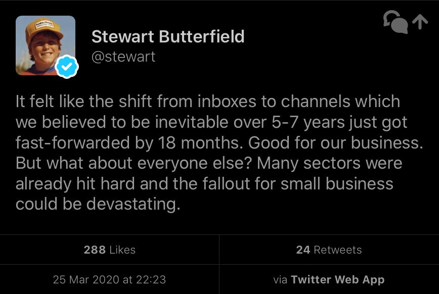 But this tweet identifies perfectly the shift Business is facing, independent to this pandemic. He estimates that the shift from email communication, which is that backbone of so many companies today, is moving to channel communications and that that has accelerated by possibly 18 months as a result of this pandemic. I would argue that it has accelerated change even faster than that.